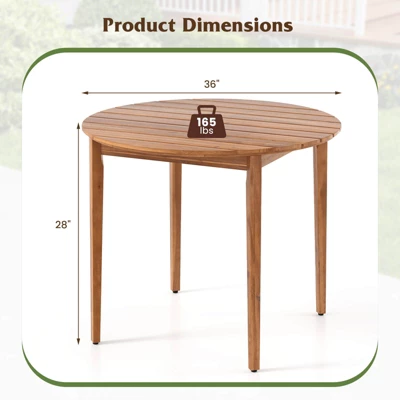 Boasting dimensions of 36″ x 28″ (Dia. x H), the diner table provides a dining area that can comfortably accommodate up to 4 individuals. The dining table crafted from solid acacia wood, which is renowned for its robustness and longevity. Reinforced by triangle corners and wood slats, the patio table is sturdy. Additionally, the adjustable foot pads ensure your dining table remains stable. The natural wood grains and sleek lines imbue the round dinette table with elegance and a touch of natural appeal, making it a standout piece in any indoor or outdoor setting. The natural appearance allows you to unleash your creativity through DIY painting, making every meal an opportunity for artistic expression.