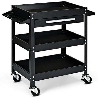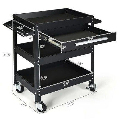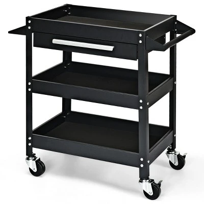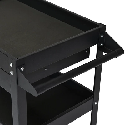 This is our new tool trolley, which is perfect for home, garage, warehouse, etc. The tool cart is made of heavy duty steel, with three spacious trays, a sliding drawer and a organizer shelf with bins for inserting small parts. Our trolley also comes with 4 casters and an ergonomic handle that bring convenience for you to move the cart. A detailed instruction will help you assemble more easily. Designed with functionality, this large three-tray tool cart make your life more convenient.Don’t hesitate to buy one! Enjoy the convenience and uniformity of working time.