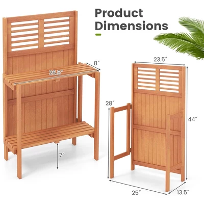 Our wood garden potting bench measures 25″ x 13.5″ x 44″ (L x W x H) and comes with 2 open shelves, providing ample space to organize and display your gardening supplies. And there exists a vertical shelf, providing easy access for gardening tools. Other than that, it is crafted of natural wood, ensuring excellent deformation resistance and long-lasting durability. And with teak oil finish ensures good weather resistance. It serves as a 2-tier plant stand, outdoor storage shelf, and indoor display shelf, making it a multipurpose addition to your garden. Whether you need a dedicated space for potting plants, storing gardening tools, or showcasing your favorite decoration, this bench has you covered. Additionally, it can be easily folded into a flat size when not in use, saving you valuable space in your shed or garage.