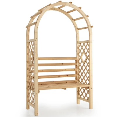Our garden arch bench measures 47.5” x 22” x 81.5” (L x W x H) providing large space for climbing plants to absorb enough sunlight and water for better growth. Furthermore, you can also decorate it with flowers and tulle used for weddings, balloons used for birthday parties, or bright LED lights used for patio decor. Other than that, it is designed with a wide 2-seat bench and a high backrest allowing you to sit or relax with your beloved one for hours on end. The bench can also be a perfect display shelf for storing various garden tools. And it adopts natural solid wood, which is characterized by great weather resistance and deformation resistance, ensuring excellent durability. Whether served as a garden climbing pergola, patio, party, or wedding decor, it can be a perfect choice!