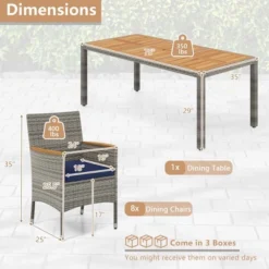 Costway 9 PCS Patio Dining Set For 8 Table And PE Rattan Chairs With 2″ Umbrella Hole Navy/White