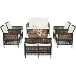 Costway 9 PCS Patio Dining Set 79″ Rectangle Dining Tables With 8 Wooden Armchairs